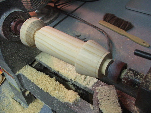 For the longer rod of the staff, I needed a tapered dowel that was about 40" in length. Problem was, my lathe only has a 12" working area. Solution?