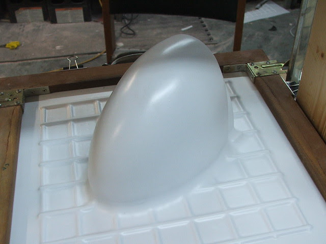 Sintra is a foamed sheet of PVC plastic, and it doesn't really like to take compound curves very well. A lot of work went into heating specific parts of the material, bending them to shape, re-heating, and repeating. There were several test fits to make sure the curve of each piece worked well with the parts next to it. The shot below shows the parts about halfway done with this process